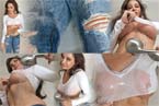 At first Tina-Marie is showering slowly her blue jeans until its soaking wet, but soon she concentrates on massaging her big firm boobs with great pleasure with the warm jet of water. She wears a long-sleeved belly top that gives us great insights of her wonderful cleavage. When slowly getting wet, the thin white top gets almost completely transparent and reveals a nice view of Tina-Maries gorgeous breasts